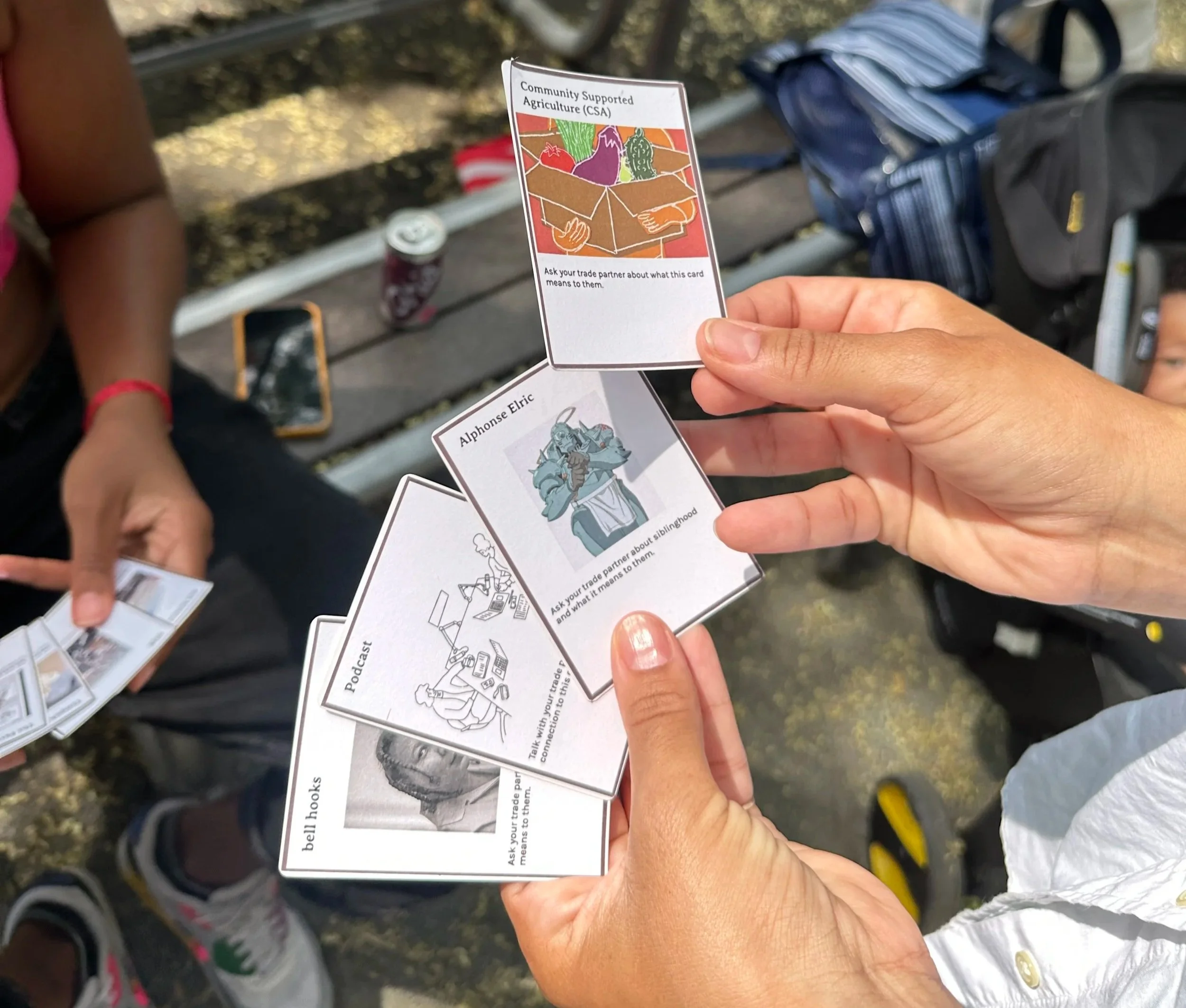 The Trading Actions invite players to share with each other about their stories, meaning, opinions, and interpretations of the information on each card